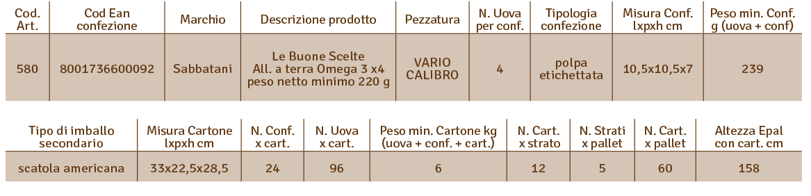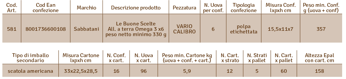 Sono uova deposte dalle galline che vivono nei nostri allevamenti a terra: ambienti protetti e confortevoli, dove sono libere di razzolare, appollaiarsi e becchettare mangimi di nostra produzione a base di cereali con semi di lino, naturalmente ricchi di acidi grassi Omega 3.